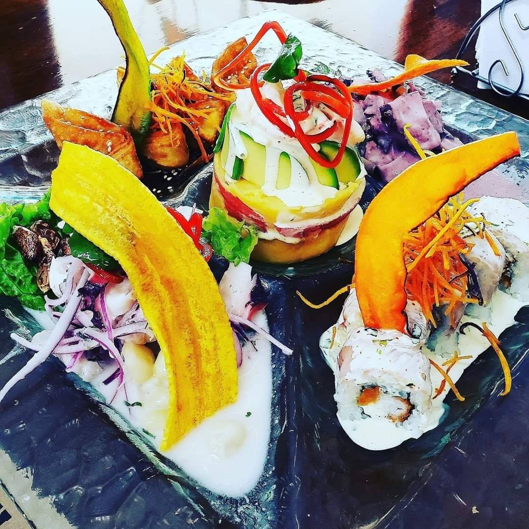 Relleno de Palta criolla, chicharrón de camarones ecuatorianos, queso crema, por dentro y afuera, atún, salsa acebichada con calamares crocantes.