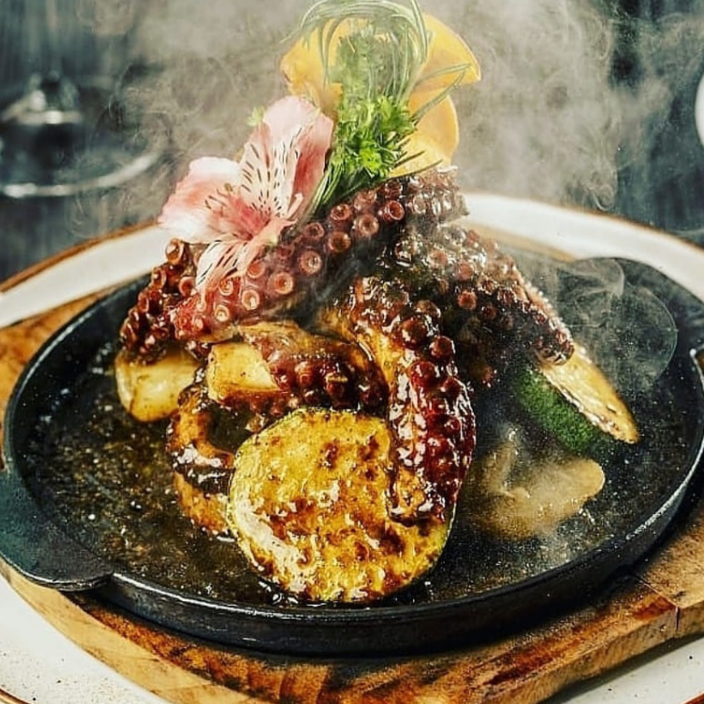 Desde nuestras costas nortinas llega el mejor pulpo cocido mágicamente para que quede blandito luego marinado con nuestro chimichurri de la casa y al grill, acompañado de zapallo italiano y papas grilladas.