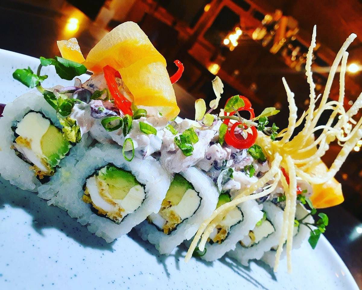 Relleno de chicharrones de camarones ecuatoriano, palta criolla, queso crema y por fuera envuelto en palta, toque de sésamo blanco y negro, bañado en salsa de maracuyá nikkei.